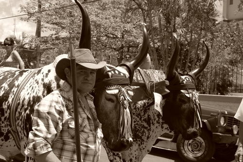 La gente de aquí y de allá toma las calles y toman fotografías de los representantes del boyeo costarricense. Los boyeros y las boyeras se detienen cada 20 metros para que la gente se tome fotografías con las bestias. Los boyeros muestran sus dotes de domadores al lograr que los bueyes de más de 300 kilos se queden quietos y permanezcan con sus cabezas en alto. Todo está listo para una linda captura digital. Las cámaras tienen hambre de lo nuestro y sus estómagos no se detienen, quieren llenarse de cada rostro, carreta y detalle.