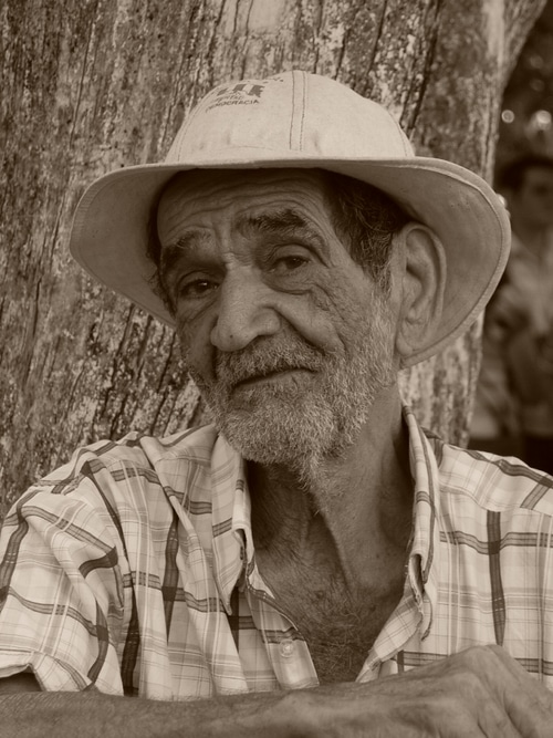 Bueno vuelvo a la actividad en el parque. Es normal que en estas actividades con tanta gente uno no repare en detalles y que el bosque de gente nos haga perder lo singular. La gente está concentrada en ver pasar la entrada de los boyeros. La gente aplaude su paso. Ahí en medio del tumulto localizamos a don Ricardo un buen representante de la edad de Oro, un lindo abuelito ateniense. Todos pasan a la par de él pero no le ven, don Ricardo esta de cuclillas arrecostado a un árbol de mango. Su rostro es testigo silencioso de todos los cambios que se han dado en su querida Atenas. Sus arrugas muestran las jornadas de trabajo y la acumulación de calendarios. Mi hermano José y yo nos acercamos a don Ricardo y nos agachamos para hablar con él. La gente continua de aquí para allá, todos tienen prisa corren al otro lado del parque al costado de la soda San Martin. Quieren volver a saludar y fotografiar a las boyeras y boyeros. Mi hermano y yo seguimos con don Ricardo, el es un artesano que le saca yutas de bueyes a la madera. El hace parir cada trozo de cedro. Cada parto nos da un par de bueyes, carreta y yugo. No hace falta hablar mucho con él para sentir su belleza y oler un poco de su historia de vida. No es el típico rostro que una revista desea tener en su portada, pero nuestras cámaras si son cautivadas por el Abuelo ateniense.