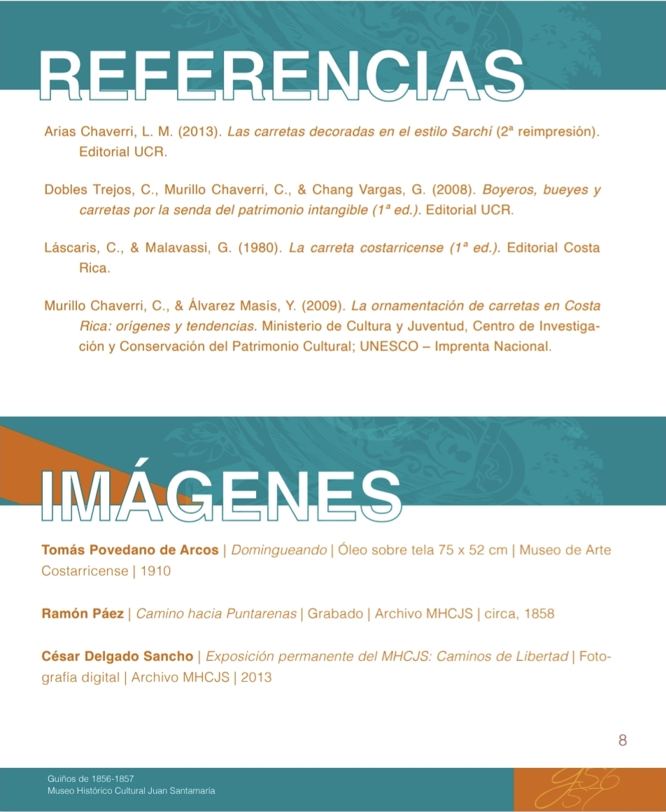 Murillo Chaverri, C., & Álvarez Masís, Y. (2009). La ornamentación de carretas en Costa Rica:orígenes y tendencias. Ministerio de Cultura y Juventud, Centro deInvestigación y Conservación del Patrimonio Cultural; UNESCO – ImprentaNacional.