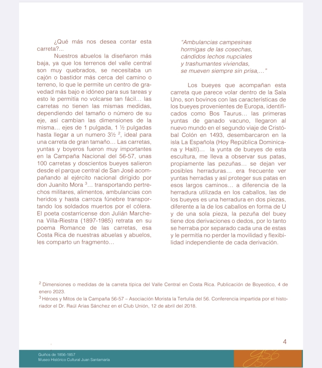 Nuestros abuelos la diseñaron más baja, ya que los terrenos del valle central son muy quebrados, se necesitaba un cajón o bastidor más cerca del camino o terreno, lo que le permite un centro de gravedad más bajo e idóneo para sus tareas y esto le permitía no volcarse tan fácil… las carretas no tienen las mismas medidas, dependiendo del tamaño o número de su eje, así cambian las dimensiones de la misma… ejes de 1 pulgada, 1½ pulgadas hasta llegar a un numero 3 ½[2], ideal para una carreta de gran tamaño… Las carretas, yuntas y boyeros fueron muy importantes en la Campaña Nacional del 56-57, unas 100 carretas y doscientos bueyes salieron desde el parque central de San José acompañando al ejército nacional dirigido por don Juanito Mora[3]… transportando pertrechos militares, alimentos, ambulancias con heridos y hasta carroza fúnebre transportando los soldados muertos por el cólera. El poeta costarricense don Julián Marchena Villa-Riestra (1897-1985) retrata en su poema Romance de las carretas, esa Costa Rica de nuestras abuelas y abuelos, les comparto un fragmento…