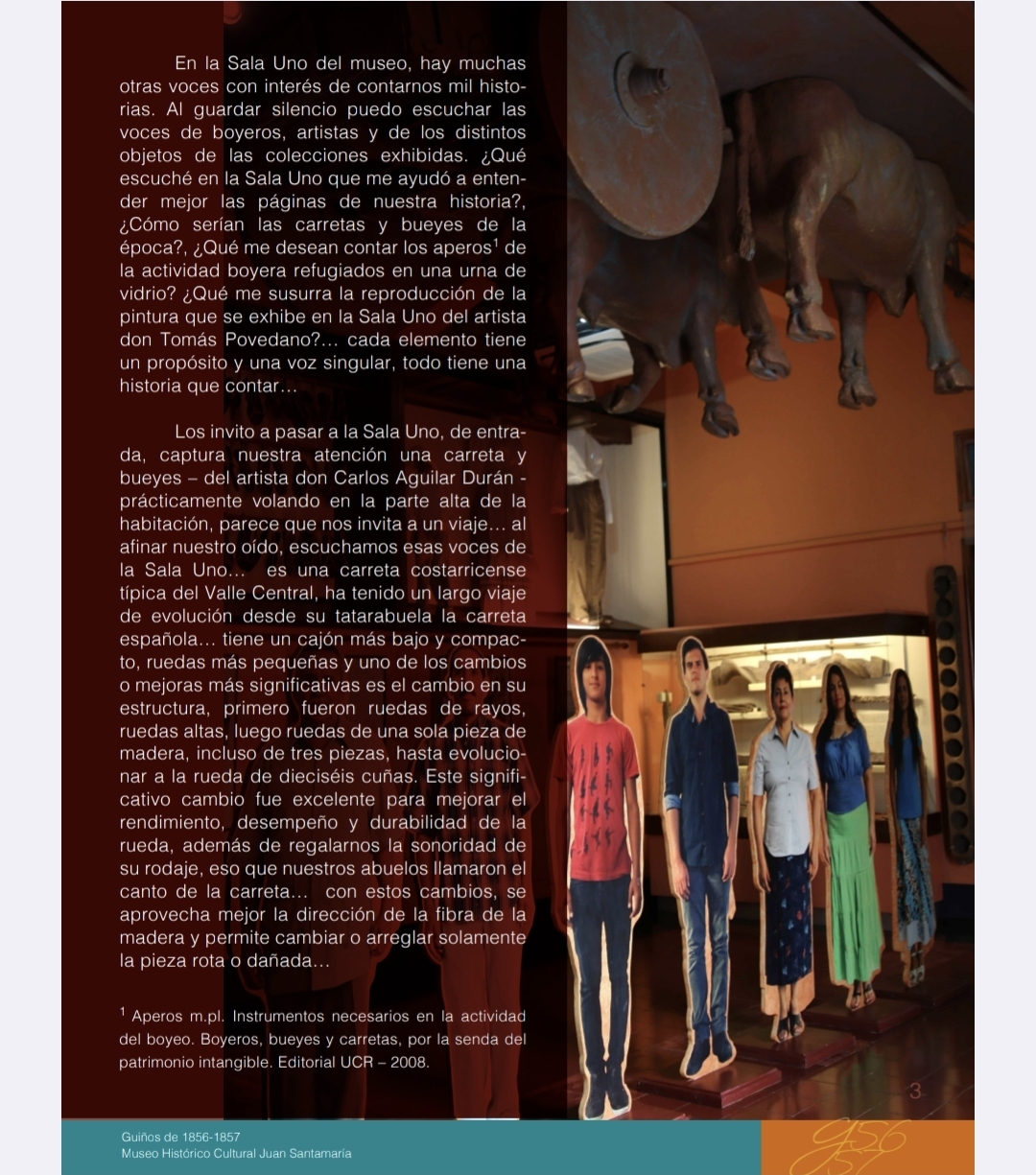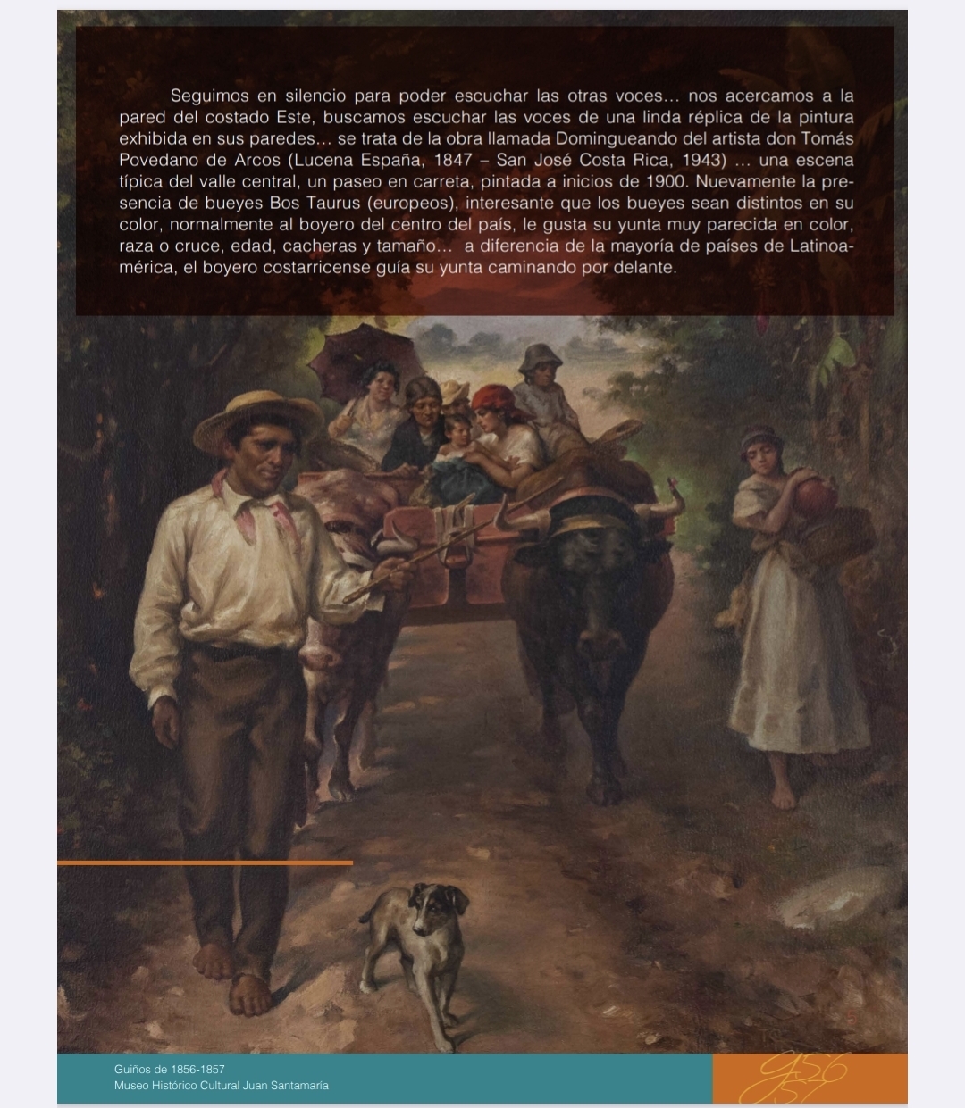 En la Sala Uno del museo, hay muchas otras voces con interés de contarnos mil historias. Al guardar silencio puedo escuchar las voces de boyeros, artistas y de los distintos objetos de las colecciones exhibidas. ¿Qué escuché en la Sala Uno que me ayudó a entender mejor las páginas de nuestra historia?, ¿Cómo serían las carretas y bueyes de la época?, ¿Qué me desean contar los aperos[1]de la actividad boyera refugiados en una urna de vidrio? ¿Qué me susurra la reproducción de la pintura que se exhibe en la Sala Uno del artista don Tomás Povedano?… cada elemento tiene un propósito y una voz singular, todo tiene una historia que contar…